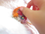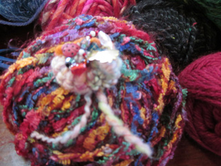 手紡ぎ毛糸のベースにボタンやビーズなどなど縫い付けて